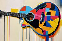 Dit kleurrijke kunstwerk toont een gitaar in een abstract en kubistisch ontwerp, waarbij felle kleuren en geometrische vormen op een dynamische manier samenkomen. De gitaar, als centraal element, wordt weergegeven met een speelse mengeling van heldere tinten en vloeiende lijnen. De verschillende kleurvlakken lopen in elkaar over, wat zorgt voor een gevoel van beweging en energie. Dit kunstwerk is perfect voor moderne interieurs en kan een levendige sfeer toevoegen aan elke ruimte. Het ontwerp biedt een creatieve kijk op een klassiek instrument en maakt het tot een boeiend middelpunt in elk interieur. Ideaal voor muziekliefhebbers of liefhebbers van abstracte kunst.
