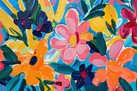 Dit levendige kunstwerk is een feest voor de zintuigen, met een explosie van kleuren die elke ruimte direct opvrolijken. De abstracte weergave van bloemen en bladeren in een scala aan heldere tinten blauw, geel, oranje, roze en groen biedt een moderne draai aan de klassieke natuurthemas. Ideaal voor zowel moderne als traditionele interieurs, dit schilderij voegt een speelse maar verfijnde touch toe aan uw woon- of werkruimte. Een must-have voor liefhebbers van kunst die hun omgeving willen verrijken met levendige kunst.