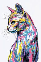Dit unieke ontwerp toont een abstracte en kleurrijke interpretatie van een kat. De levendige en dynamische kleurencombinaties, met heldere tinten geel, blauw en roze, geven het beeld een energieke uitstraling. Het gebruik van graffiti-achtige lijnen en overlappende kleuren creëert een speels en eigentijds kunstwerk, dat perfect past in een moderne of creatieve woonruimte. Dit kunstwerk trekt onmiddellijk de aandacht door de levendigheid en de abstracte benadering van een alledaags onderwerp. Het is een blikvanger voor liefhebbers van eigentijdse kunst en dieren, en brengt gegarandeerd kleur en stijl in elke kamer.