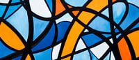 Een samenspel van levendige blauwtinten en warm oranje ontvouwt zich in dynamische lijnen. De vloeiende vormen stralen energie en creativiteit uit, terwijl het diepzwarte contrast bijdraagt aan de compositie. Dit fascinerende kunstwerk past perfect in een moderne woonkamer, waar het gesprekken stimuleert en een uitnodigende sfeer creëert.