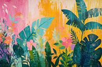 Dit abstracte ontwerp brengt een levendig palet van tropische planten en bloemen naar de voorgrond. De gedurfde kleurencombinatie van geel, roze, groen en blauw straalt energie en vrolijkheid uit, terwijl het speelse, non-figuratieve ontwerp perfect past bij een moderne of creatieve inrichting. Het schilderij vangt de essentie van een tropisch paradijs in een unieke, artistieke interpretatie. Ideaal voor wie op zoek is naar een gedurfd kunstwerk om een ruimte op te fleuren, of het nu in de woonkamer, een kantoor of een creatieve werkplek is. De levendige bloemen en planten geven een frisse, natuurlijke uitstraling die tegelijkertijd ontspannend en inspirerend werkt.