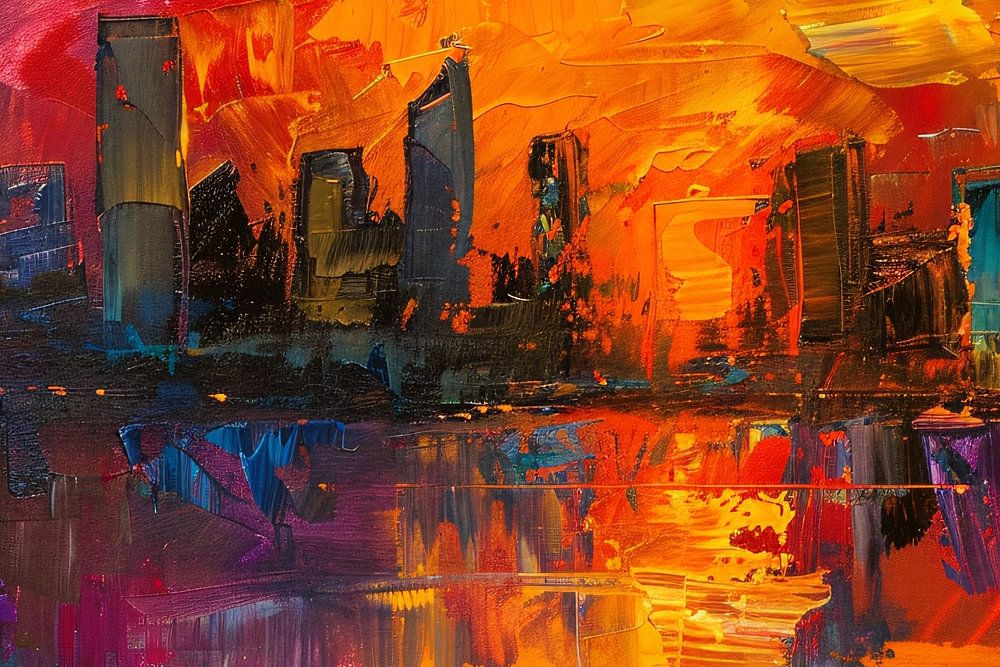 Dit levendige schilderij brengt de schoonheid van een stedelijke skyline tot leven met een explosie van kleuren. De felle oranjes en roden suggereren een zonsondergang die de stad in warm licht baadt, terwijl de spiegeling in het water een extra dimensie van diepte en contrast toevoegt. Perfect voor moderne interieurs, dit kunstwerk brengt dynamiek en kleur in elke ruimte, van kantoren tot woonkamers. De abstracte stijl nodigt de kijker uit om een eigen interpretatie en emotionele reactie te ervaren, waardoor het een prachtige aanvulling is op elke kunstcollectie.