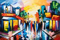 Dit levendige en kleurrijke kunstwerk brengt de stad tot leven met een explosie van heldere tinten en een unieke kubistische stijl. Het ontwerp vangt een stedelijk tafereel met abstracte vormen en een dynamische compositie, waarbij zowel gebouwen als menselijke figuren op een speelse manier worden weergegeven. De felle kleuren zoals blauw, geel en rood creëren een opvallend contrast tegen de achtergrond van een lucht met warme tinten. Dit schilderij is een echte blikvanger en kan elke ruimte verlevendigen met zijn energieke uitstraling. Perfect voor moderne interieurs die een vleugje abstractie en creativiteit willen toevoegen.
