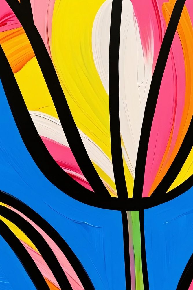 Dit levendige kunstwerk straalt een speelse en moderne sfeer uit, perfect voor liefhebbers van kleurrijke en abstracte ontwerpen. Het ontwerp toont een grote, gestileerde tulp die is afgebeeld in felle tinten van roze, geel, en wit, met een contrasterende felblauwe achtergrond. De dikke, zwarte omlijningen geven het geheel een grafisch karakter dat doet denken aan popart en moderne kunst. Dit schilderij voegt kleur en dynamiek toe aan elke ruimte, of het nu gaat om een woonkamer, kantoor of slaapkamer. De krachtige vormen en het heldere kleurenpalet zorgen voor een energieke uitstraling, ideaal voor degenen die op zoek zijn naar een opvallend stuk dat zowel eigentijds als artistiek is.