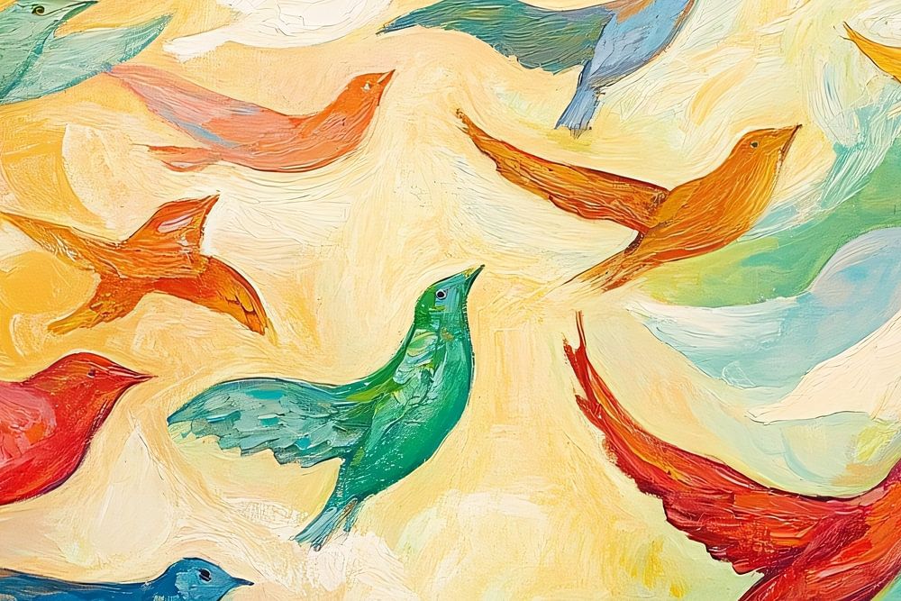 Dit ontwerp brengt een levendige en expressieve weergave van vogels in volle vlucht. De kleurrijke vormen en gedurfde penseelstreken creëren een dynamisch gevoel van beweging en vrijheid. De mix van heldere tinten, zoals rood, blauw, geel en groen, vormt een harmonieuze samenstelling die direct de aandacht trekt. Dit schilderij past perfect in een modern interieur en voegt een sprankelende en creatieve sfeer toe aan elke ruimte. Door de abstracte benadering en het levendige kleurenpalet is het een opvallend stuk dat zowel rust als energie uitstraalt, ideaal voor liefhebbers van expressieve en moderne kunst.