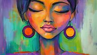 De sierlijke oorbellen en verfijnde gezichtskenmerken geven het werk een subtiel vleugje luxe en vrouwelijkheid. Met prachtige paarse, oranje en gele kleurtinten en een uniek en exclusief ontwerp maakt dit tot een stijlvolle fotoprint die prachtig staat in elke ruimte.