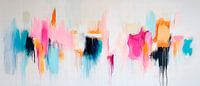 Een spannend kleurenspel ontvouwt zich in levendig roze, zacht blauw en oranje die dynamisch in elkaar overvloeien. De vloeiende vormen lijken verhalen te vertellen terwijl ze licht en energie door de kamer verspreiden. Ideaal voor de woonkamer, waar creativiteit en levensvreugde centraal staan.
