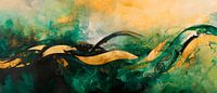 Zachte golven in diepe groene en gouden tinten dansen harmonieus over het canvas en voegen een kalme elegantie toe aan elke kamer. De dynamische beweging en het warme kleurenpalet creëren een uitnodigende sfeer, ideaal voor een woonkamer waar ze gesprekken stimuleren en de kamer in stijl opfleuren. Een echte blikvanger!