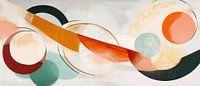 Zachte kleurovergangen in warme terracotta en koele minttinten vloeien harmonieus in elkaar over en creëren een gevoel van beweging en lichtheid. De cirkelvormige elementen geven de ruimte een dynamisch tintje. Ideaal voor de woonkamer om een uitnodigende sfeer te creëren die creativiteit en ontspanning stimuleert.