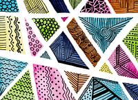 Schattige waterverf zentangle in kleurrijke vormen met inktlijnen, strepen en stippen.