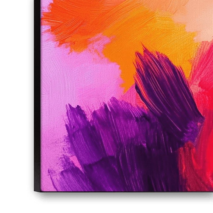 Een levendig kleurenspel komt tot leven, met zachte paarse en gedurfde rode tinten die moeiteloos in elkaar overvloeien. De dynamische penseelstreken brengen energie en warmte in de kamer. Ideaal voor een moderne woonkamer of creatieve werkruimte waar inspiratie en goed humeur centraal staan.