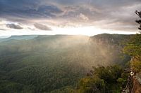 Een kleurrijke avondlucht spreidt zich uit over de Blue Mountains terwijl de zon langzaam naar het westen zakt achter de lange rotsrichel van Narrow Neck. Zachte zonnestralen vallen door de wolken en laten de horizon gloeien in warme gouden en oranje tinten. De brede vallei opent zich beneden, waar fijne mist tussen de dichtbeboste…
