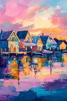 Een betoverend schouwspel van warme kleuren en zachte weerspiegelingen, waar de kleine huisjes op het kalme water lijken op een schilderij uit een andere tijd. Dit idyllische tafereel straalt rust en sereniteit uit en creëert een uitnodigende sfeer. Perfect voor de woonkamer, het geeft de kamer een harmonieuze, ontspannen touch.