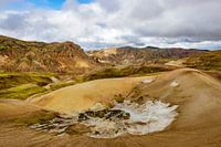 Kleurrijke bergen rond het Landmannalaugar gebied in IJsland met stoomputten in het geothermische gebied tijdens de zomer in het Fjallabak Natuurreservaat in de Hooglanden van IJsland.