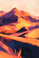 Glooiende heuvels en majestueuze bergen worden gepresenteerd in warme, levendige kleuren, die een gevoel van uitgestrekte landschappen en vrijheid overbrengen. De dynamische verscheidenheid aan vormen creëert een indruk van beweging en energie. Deze kunstwerken zijn een perfecte aanvulling voor een woonkamer die gezelligheid en inspiratie wil uitstralen.