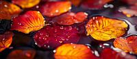 Levendige herfstbladeren drijven zachtjes op het reflecterende oppervlak, terwijl fijne waterdruppels fonkelen als kleine diamantjes. Deze harmonieuze kleurencombinatie van warme rode tinten en zachte gele nuances creëert een rustgevende sfeer in elke ruimte. Vooral in de badkamer creëert het beeld een ontspannen oase van welzijn en nabijheid tot de natuur.