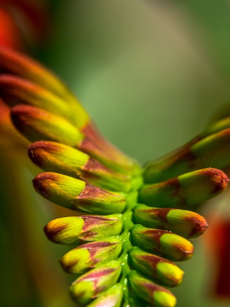 Een geel rode bloem die begint uit te bloeien , de knoppen laten de rode bladeren zien van de bloem, deze zitten is om en om op de steel vast.