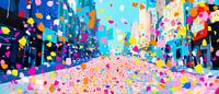 Een levendige werveling van kleurrijke bloemblaadjes ontvouwt zich in een stedelijk landschap dat een vrolijke sfeer uitstraalt. De felle kleuren roepen levensvreugde en optimisme op. Dit kunstwerk is ideaal voor de woonkamer en verandert elke ruimte in een plek van inspiratie en vrolijk samenzijn.