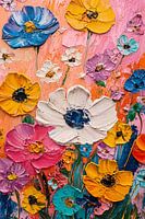 Dit schilderij toont een levendig palet van kleurrijke bloemen, gemaakt met dikke verflagen die een opvallende textuur creëren. De expressieve penseelstreken brengen het geheel tot leven en geven het werk een dynamische uitstraling. Dit unieke ontwerp, vol felle kleuren zoals geel, blauw, roze en paars, straalt energie uit en is een ware eyecatcher voor iedere ruimte. Of het nu wordt gebruikt in een woonkamer of kantoor, het voegt een speels en modern tintje toe aan het interieur. De zorgvuldig gekozen kleurcombinaties maken het werk een ideale keuze voor liefhebbers van abstracte kunst en natuur.