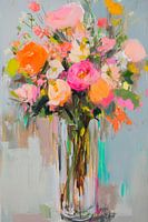 De afbeelding toont een prachtig boeket bloemen in een cilindervormige vaas. Stralende kleuren zoals felroze, zacht oranje en delicate witte tinten combineren harmonieus en roepen een vrolijke, levendige sfeer op. De losse penseelstreken geven het arrangement een dynamische lichtheid, terwijl de eenvoudige achtergrond de bloemen op indrukwekkende wijze benadrukt.