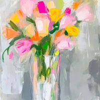 De foto toont een levendig boeket bloemen in een heldere glazen vaas. Kleurrijke bloesems in levendige tinten roze, geel en oranje contrasteren met een zachtgrijze achtergrond. De dynamische penseelstreken brengen een vrolijke, bijna speelse sfeer over die de aandacht trekt en de schoonheid van de natuur viert.