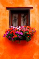 De foto toont een charmant raam in een fel oranje gloed van kleur. Het houten frame omringt de ruiten, terwijl eronder een weelderige bloembak met felrode, paarse en roze bloemen bloeit. De levendige kleuren creëren een uitnodigende en vrolijke sfeer.
