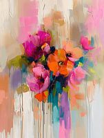 Kleurrijke bloemen in roze, blauw en oranje. Een bijzondere blikvanger voor je interieur! Modern en abstract. Kies zelf het formaat en materiaal bij dit werk en maak het helemaal naar wens.