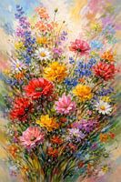 Een kleurrijk en expressief bloemenbeeld voor in de woonkamer. Het straalt optimisme en vrolijkheid uit. De schoonheid van de natuur is altijd een onuitputtelijke bron van inspiratie. Bloemenfantasieën zijn kunstig geënsceneerd...bloemen, bloesems, bladeren