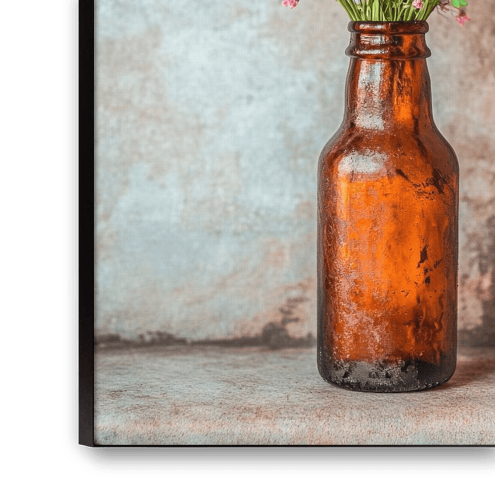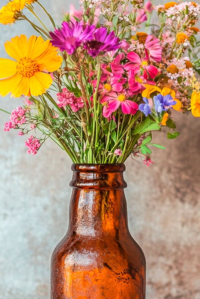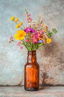 Levendige kleuren ontspruiten uit een rustieke, bruine glazen fles en roepen een vrolijke sfeer op. De delicate bloemen, in verschillende tinten paars en geel, stralen natuurlijke charme en frisheid uit. Dit arrangement is ideaal voor in de keuken of een gezellige woonkamer en brengt een vleugje zomer en levendigheid in elke kamer.