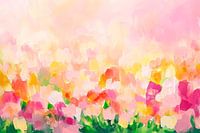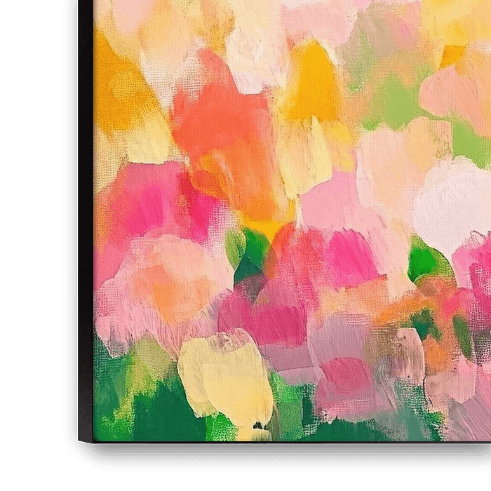 Een zachte explosie van bloemenkleuren die harmonie en frisheid uitstralen. De zachte overgangen van roze, geel en groen brengen een gevoel van lichtheid en vreugde over. Dit kunstwerk is ideaal voor de woonkamer, creëert een uitnodigende sfeer en verandert elke kamer in een bloeiende oase van ontspanning.