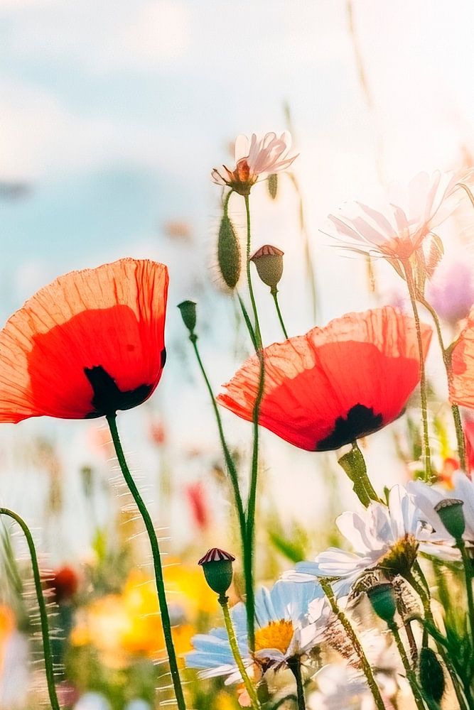 Levendige klaprozen dansen in de zachte bries, omringd door een kleurrijke zee van wilde bloemen, terwijl de zon zachtjes door de wolken schijnt. Dit harmonieuze tafereel brengt een vleugje frisheid en levensvreugde in elke kamer, perfect voor de woonkamer om een uitnodigende en inspirerende sfeer te creëren.