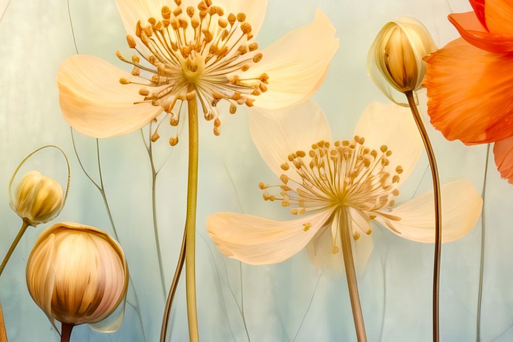 Kleurrijke bloemenweide. Zomertijd. Blauwe achtergrond.