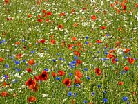 Veld met bloeiende klaprozen en korenbloemen in de zomer. Mönchgut op het eiland Rügen in Duitsland.