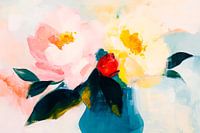 Delicate bloemen in zachte pasteltinten ontvouwen hun pracht en stralen een uitnodigende frisheid uit. De harmonieuze compositie van roze en gele tinten, gecombineerd met een helder rood accent, tovert levensvreugde in elke kamer. Ideaal voor in de keuken om tijdens het koken een bloeiende sfeer te creëren die elk moment opfleurt.