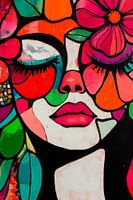 De afbeelding toont een kleurrijk portret van een vrouw wiens gezicht wordt omlijst door levendige bloemmotieven en zachte kleuren. De grote, gesloten ogen en gestileerde lippen stralen rust en schoonheid uit. De mix van heldere kleuren en organische vormen straalt een harmonieuze verbinding met de natuur en innerlijke kracht uit.