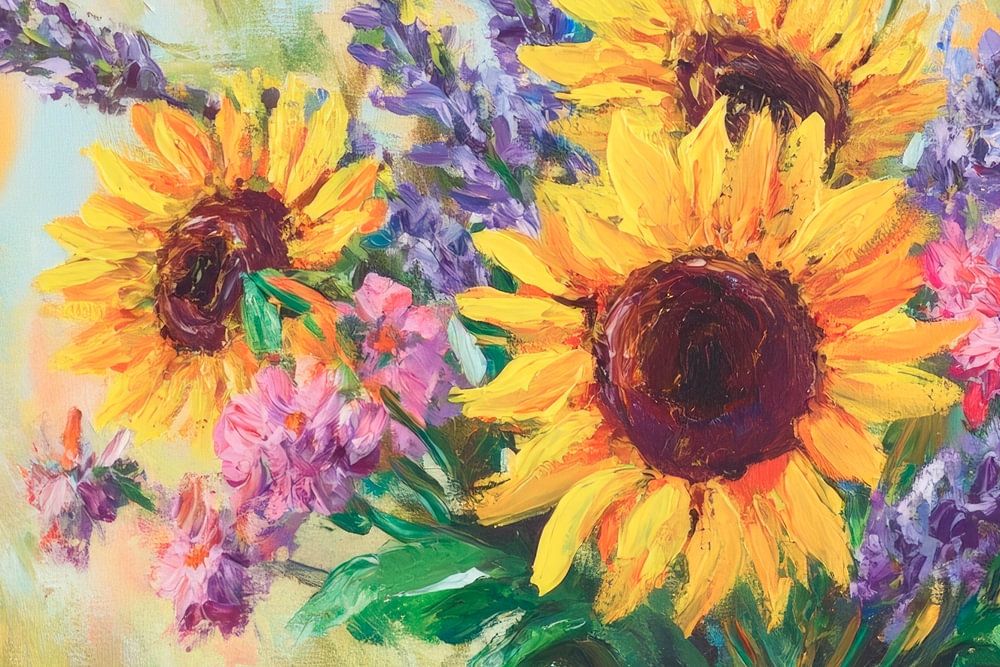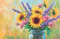 Een stralend boeket van zonnebloemen en paarse lavendel brengt de kamer tot leven. De warme geeltinten en zachte pasteltinten stralen frisheid en levendigheid uit, terwijl de nostalgische glazen vaas een vleugje landelijke romantiek toevoegt. Dit kunstwerk is ideaal voor in de keuken, creëert een uitnodigende sfeer en inspireert tot gezellige momenten.