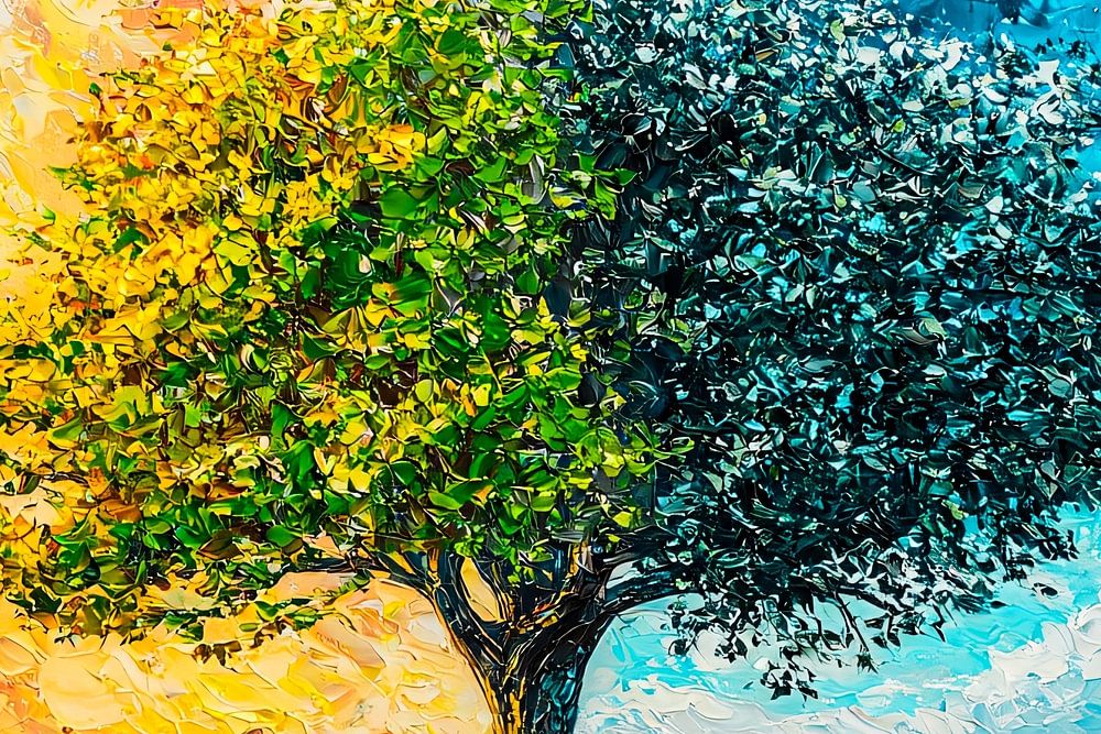 Een kleurrijk kunstwerk dat een boom centraal plaatst tussen dag en nacht. De linkerzijde straalt een warme en zonnige sfeer uit met een gouden hemel, terwijl de rechterzijde een kalme nachtelijke hemel toont met sterren en een maan. Dit schilderij brengt balans tussen licht en donker, perfect voor iedereen die een unieke en sprekende decoratie aan de muur wil. Het voegt een vleugje kleur en artistieke flair toe aan elke ruimte.