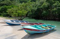 Kleurrijke boten aangemeerd aan een tropische rivier in Samana, die al snel uitmondt in zee