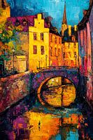 Dit kunstwerk straalt energie en levendigheid uit door het gebruik van intense kleuren en expressieve penseelstreken. De brug, centraal in de compositie, wordt omlijst door kleurrijke gebouwen en reflecties in het water, wat een magische sfeer creëert. Perfect voor moderne interieurs, brengt dit werk warmte en karakter in elke ruimte. Ideaal voor kunstliefhebbers die van kleurrijke en dynamische ontwerpen houden.