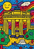 Vrolijke cartoonillustratie van de Brandenburger Tor in Berlijn met krachtige lijnen en heldere kleuren. Omringd door regenbogen, bloemen, bomen en een lachend zonnenmotief krijgt het iconische gebouw een vriendelijke uitdrukking. Het motief straalt vreugde, levendigheid en speelse charme uit en brengt tegelijkertijd de Duitse cultuur op een kleurrijke, kinderlijke en speelse manier over.