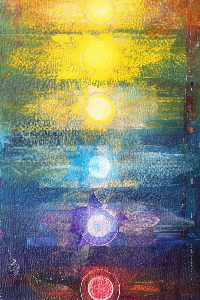 Dit schilderij toont een abstracte voorstelling van chakra's, weergegeven door verticale kleurlagen in helder blauw, paars, geel en rood. De voorstelling doet denken aan een spirituele reis door de energiecentra van het lichaam en straalt een warm, helend effect uit. Ideaal voor kamers met een spiritueel of meditatief karakter.