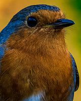 Een prachtige close-up van een roodborstje. Het verenkleed is tot in detail zichtbaar. De achtergrond gevorm door de natuurlijke omgeving is mooi kleurrijk.