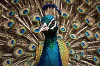 Deze prachtige close-up van een pauw brengt de adembenemende schoonheid van de natuur tot leven. De pauw, met zijn levendige kleuren en indrukwekkende verenkleed, vormt een betoverend onderwerp. De combinatie van diepblauwe en groene tinten met het schitterende goud van de veren zorgt voor een visueel spektakel dat de aandacht trekt. Dit ontwerp straalt elegantie en natuurlijke pracht uit, en zou perfect passen in elke ruimte waar een vleugje natuur en verfijning gewenst is. Het detail in het verenkleed van de pauw benadrukt de complexiteit en pracht van dit dier, wat het een ideaal kunstwerk maakt voor liefhebbers van dieren en natuurlijke schoonheid.
