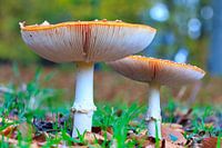 Heilooer Bos, Landgoed Nijenburg, Kleurrijke close-up van deze twee vliegenzwammen, perfect scherp op beide zwammen en wazige achtergrond.