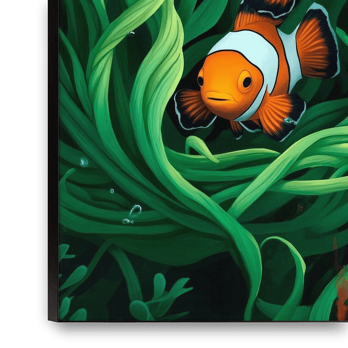 In een levendige onderwaterwereld dartelen twee feloranje clownvissen tussen glinsterende groene zeedieren. Hun felle kleuren en karakteristieke witte strepen steken indrukwekkend af tegen de donkere, mysterieuze diepten van de zee, terwijl zachte lichtstralen het landschap verlichten. Een harmonieus samenspel van kleuren en texturen…