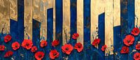 Helderrode klaprozen ontvouwen hun pracht in een harmonieus samenspel van diepblauw en glinsterend goud. De geometrische vormen creëren een moderne elegantie die levendige frisheid en tijdloze schoonheid combineert. Perfect voor een woonkamer, het geeft de kamer een vleugje kunst en stijl dat uitnodigt om te blijven hangen.