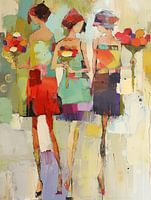 Kleurrijke dames. Dit zouden zomaar vriendinnen kunnen zijn op weg naar een feestje. Kleurrijk, modern en abstract. Een echte blikvanger!