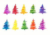 Kleurrijke, abstracte dennenbomen staan in twee rijen, elk afgebeeld in een unieke tint in tinten over de regenboog van geel, oranje, rood, roze, paars, blauw en groen. Het levendige en speelse ontwerp creëert een feestelijke en vrolijke sfeer.