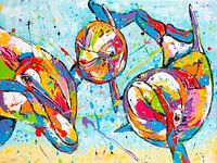 Kleurrijk schilderij met 3 vrolijke dolfijnen.