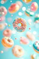 Een visueel genot dat de zintuigen prikkelt! Kleurrijke, zwevende donuts met glinsterende glazuurglitter en pastelkleuren creëren een speelse, uitnodigende sfeer. Perfect voor de keuken, waar plezier en creativiteit gedijen bij het bakken - een ideale blikvanger die je doet glimlachen terwijl je van je koffie geniet!